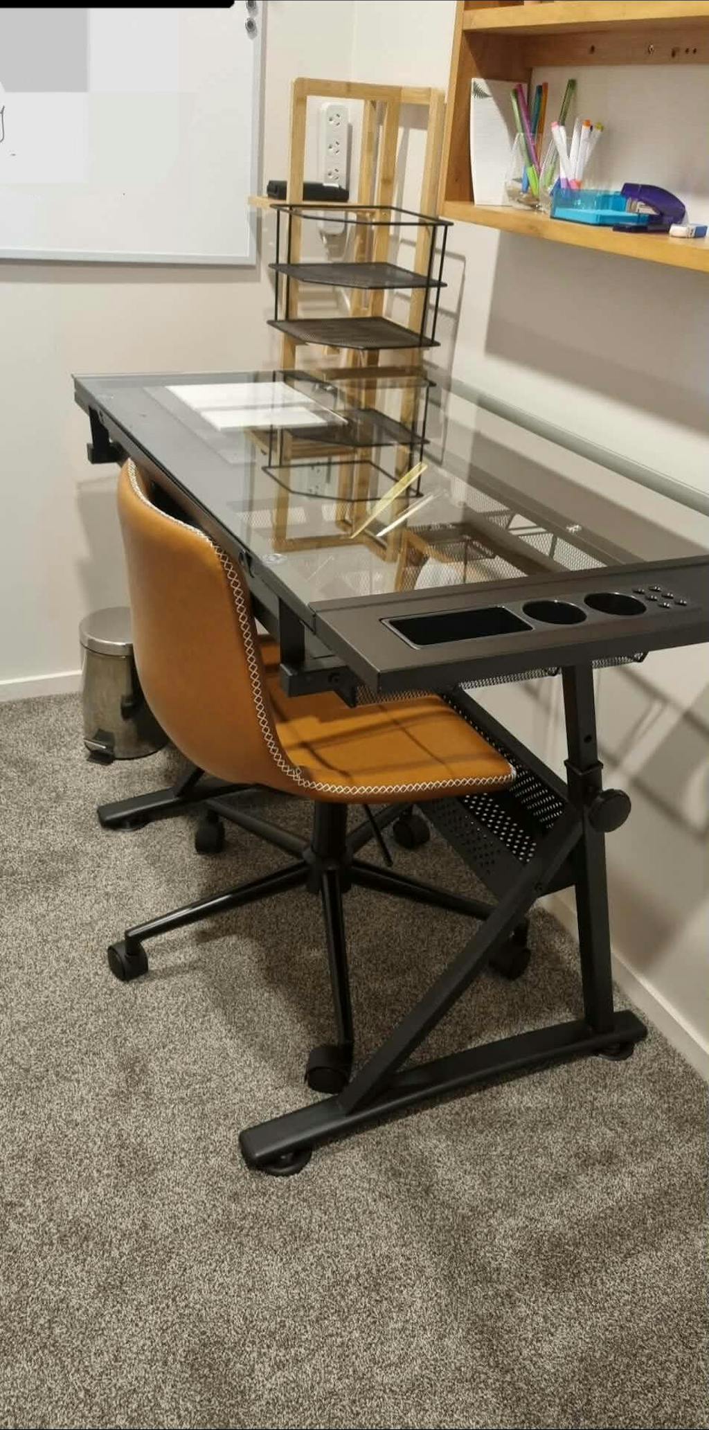 Crafted with an 8mm thick tempered glass tabletop, this drafting table offers a clear display while resisting scratches and stains for lasting durability. Complementing this is the stretchable MDF side table, providing additional space for books, laptops, and more. The glass tabletop, adjustable in height and angle, allows you to customise your setup to suit your needs, and includes an integrated stationery tray for organising your pens and tools. The addition of two metal drawers and a storage rack beneath the table ensures ample space to store papers, paints, drafting tools, and other items, keeping your workspace clean and tidy.